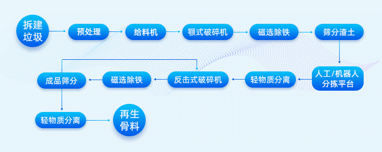 該生產(chǎn)線原料為建筑垃圾(拆遷垃圾、裝修垃圾、混凝土塊);產(chǎn)能為100噸/時;成品料主要用于再生骨料、再生砂、再生磚原料......