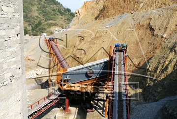 開山爆破的石灰石,經(jīng)過F5X1360給料機預(yù)篩分,50mm以下小料及渣土進入除土篩,小料直接輸送到鄂破的出料皮帶上,大料經(jīng)過顎破破碎后和小料一起進入中轉(zhuǎn)料倉,而后由皮帶輸送機進入一臺CI5X1520新型液壓反擊破破碎,出來的石料經(jīng)過兩臺S5X2460-2新型振動篩篩分,大料返到一臺PF1315反擊破破碎,20-31.5mm成品碎石篩出,其余0-20mm碎石進入兩臺S5X2460-3進行篩分,篩分出0-5-10-20三種成品。