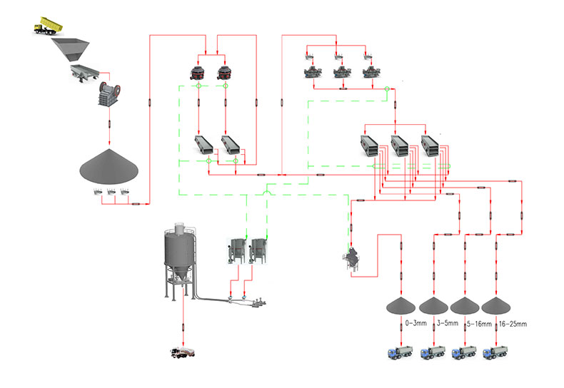 日運(yùn)轉(zhuǎn):16小時(shí)   進(jìn) 料:花崗巖,0-800mm   成品:0-3、3-5、5-10、10-31.5mm