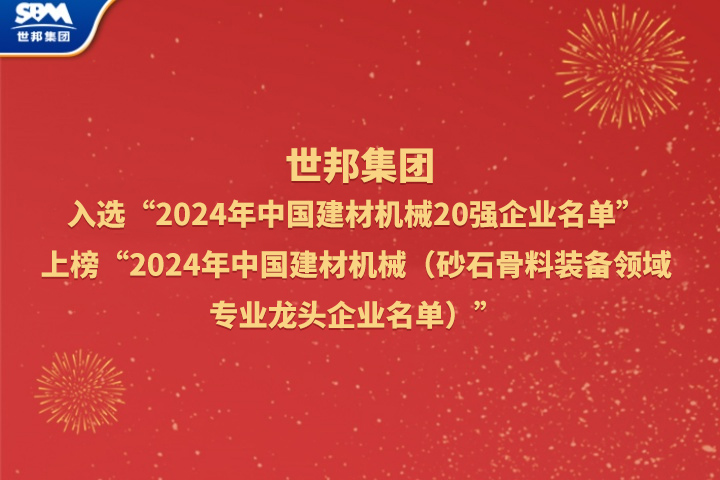 近日,世邦集團入選中國建材機械工業(yè)協(xié)會公布的“2024 年中國建材機械 20 強企業(yè)名單”上榜“2024 年中國建材機械(砂石骨料裝備領域)專業(yè)龍頭企業(yè)名單”