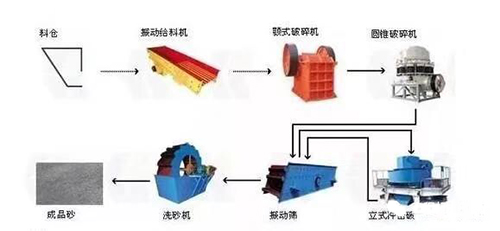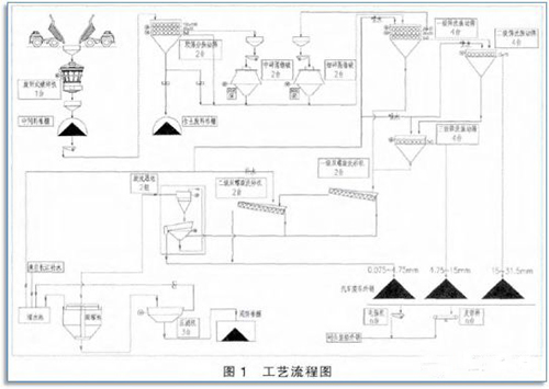 半干法生產(chǎn)是指破碎及破碎前工段無用水、破碎后工段用水洗,主要適用于我國南方、水資源豐富或礦石原料中夾雜的粘土料無法通過干法篩分剔除干凈的地區(qū)。當(dāng)然,北方一些對機(jī)制砂要求較高的地區(qū)也有選擇濕法制砂。