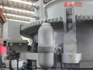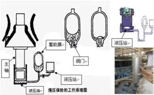 過(guò)鐵時(shí),液壓油注入蓄能器,主軸下墜;過(guò)鐵后,蓄能器將油壓回,破碎機(jī)正常運(yùn)行。清腔時(shí)也是用液壓泵。