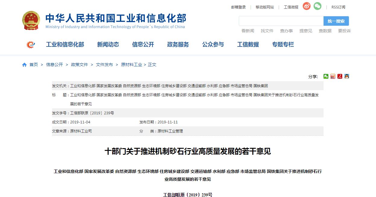 2019年11月11日,工業(yè)和信息化部、國家發(fā)展改革委、自然資源部、生態(tài)環(huán)境部、住房城鄉(xiāng)建設(shè)部、交通運(yùn)輸部、水利部、應(yīng)急部 、市場監(jiān)管總局和國鐵集團(tuán)等國家十部門發(fā)布《關(guān)于推進(jìn)機(jī)制砂石行業(yè)高質(zhì)量發(fā)展的若干意見》。在此之前,已有多省出臺政策,通過建立機(jī)制砂生產(chǎn)基地、發(fā)布機(jī)制砂應(yīng)用標(biāo)準(zhǔn)等措施,促進(jìn)機(jī)制砂推廣應(yīng)用。