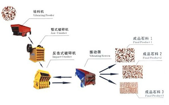 大塊石料經(jīng)料倉由振動給料機均勻的送進顎式破碎機進行粗碎,粗碎后的石料由輸送機送到反擊式破碎機進行進一步破碎,細碎后的石料由輸送機送到振動篩進行篩分,篩分出幾種不同規(guī)格的石子,滿足顆粒要求的石子,由成品輸送機送往成品料堆,不滿足顆粒要求的石子,由輸送機返料送到反擊式破碎機進行再次破碎,形成閉路多次循環(huán),成品粒度可按照用戶的需求,進行組合和分級,為保護環(huán)境,可配置輔助的除塵設(shè)備。