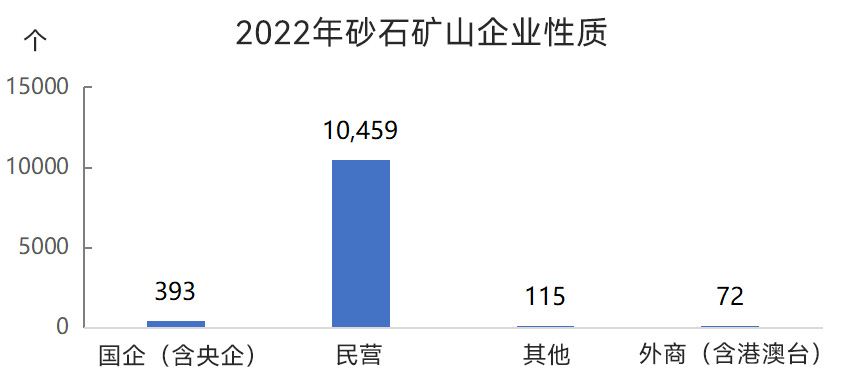 從砂石礦山企業(yè)性質(zhì)來看,國有企業(yè)(含央企)393個,民營企業(yè)較多為10459個,其他類型企業(yè)115個,外商(含港澳臺)企業(yè)72個。