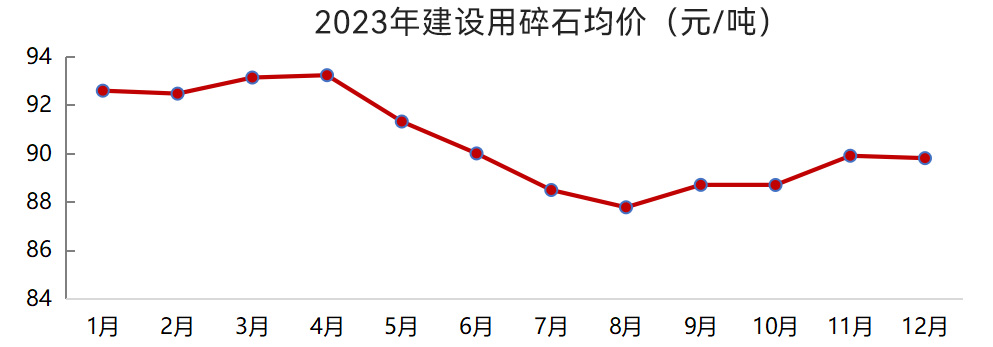 2023年12月,建設(shè)用碎石均價90元/噸,較年初下降3%。