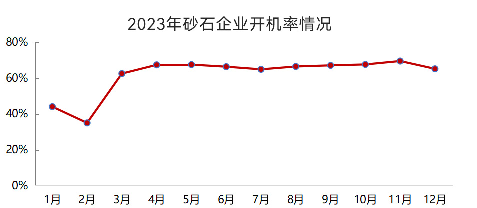 2023年,我國砂石企業(yè)產(chǎn)能利用率和開機率除了年初低位運行以外,其他月份均保持較高水平。1月、2月,我國砂石企業(yè)產(chǎn)能利用率和開機率均值分別為19%、40%,3月~12月,產(chǎn)能利用率和開機率均值分別為41%、66%。
