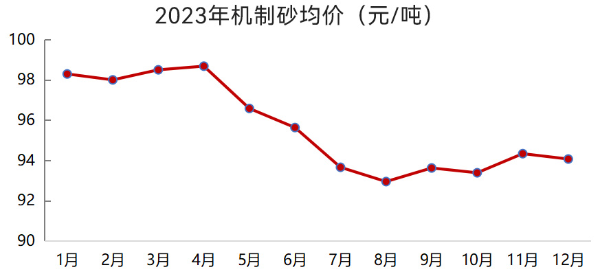 2023年12月,我國機制砂均價94元/噸,較年初下降4.3%;天然砂均價132元/噸,較年初下降1.4%。