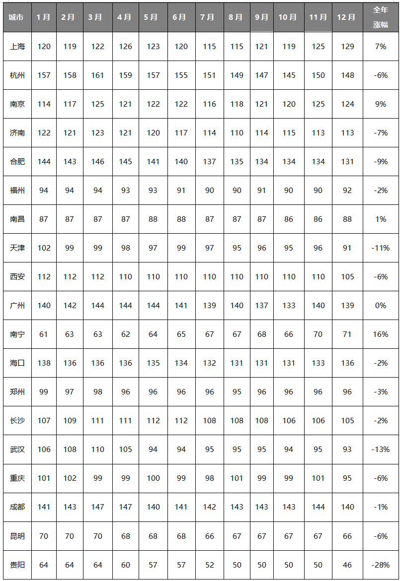 2023年中國重點城市砂石行情月度變化表(元/噸)