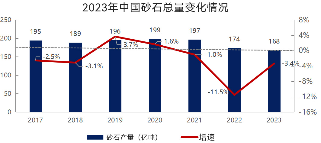 2023年國民經(jīng)濟回升向好,高質(zhì)量發(fā)展扎實推進(jìn),但外部環(huán)境復(fù)雜性、嚴(yán)峻性、不確定性上升,經(jīng)濟發(fā)展仍面臨一些困難和挑戰(zhàn)。這樣的錯綜復(fù)雜環(huán)境之下,2023年砂石產(chǎn)量、價格持續(xù)下滑,但是降幅較2022年有所縮小,人均砂石產(chǎn)量12.4噸/人,較2022年下降3.3%。部分砂石企業(yè)凈利潤出現(xiàn)不同程度下滑,甚至虧損。我國砂石工業(yè)已從增量擴張進(jìn)入存量提質(zhì)增效和增量結(jié)構(gòu)調(diào)整并重的發(fā)展新階段。供需方面:2023年,全國砂石產(chǎn)量168.35億噸,較去年下降3.35%。供給端:隨著國家多部門政策文件陸續(xù)發(fā)布,近年來國內(nèi)投資砂石骨料項目熱情高漲。不少大型央企、國企和地方平臺公司陸續(xù)布局砂石骨料業(yè)務(wù),有力推動砂石工業(yè)規(guī)?;G色發(fā)展,特別是沿江沿海區(qū)域砂石產(chǎn)能陸續(xù)釋放,全國砂石產(chǎn)能過剩風(fēng)險已初步顯現(xiàn)。市場處于供大于求的狀態(tài);需求端:房地產(chǎn)投資還在探底,基建投資持續(xù)發(fā)力,但基建對砂石市場的拉動作用有限,整體來看砂石有效需求明顯不足。