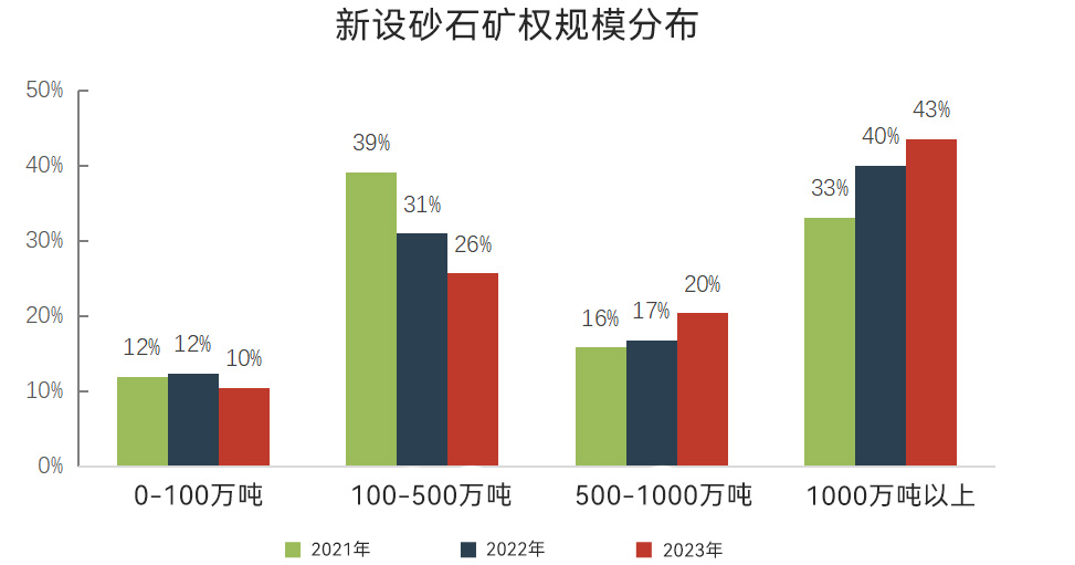 新設(shè)砂石礦權(quán)中,資源儲量大于1000萬噸的超大型砂石礦權(quán)、資源儲量在500萬~1000萬噸之間的大型砂石礦權(quán),占比分別提升至43%、20%,占比均較2022年有所提升。另外,資源儲量在100萬~500萬噸之間的中型砂石礦權(quán)占比為26%;資源儲量在100萬噸以下的小型砂石礦權(quán)占比為10%,中型、小型砂石礦權(quán)占比均較2022年有所下降。