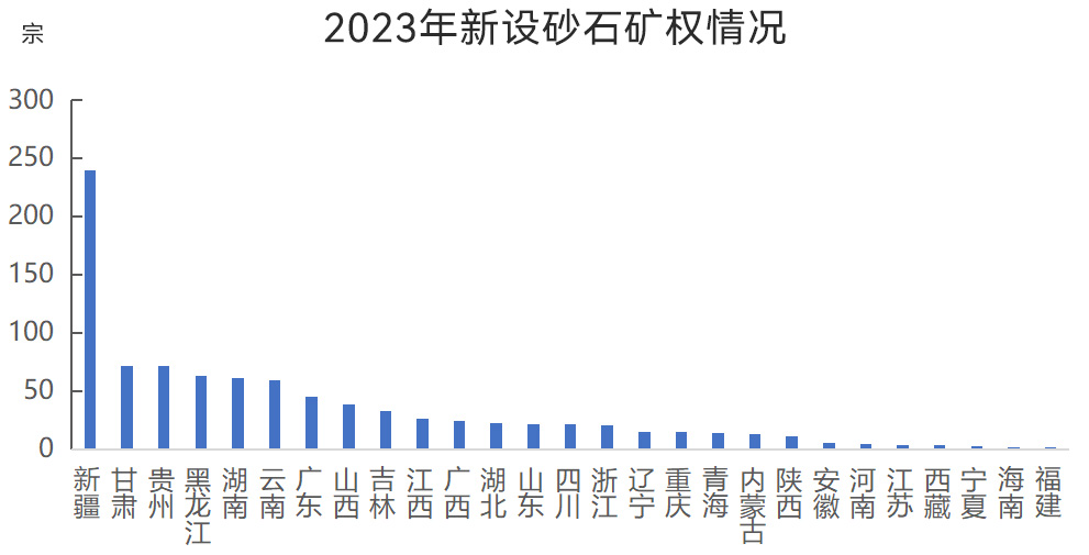 2023年,砂石企業(yè)礦權(quán)競拍趨于理性,部分砂石礦權(quán)出現(xiàn)流拍的現(xiàn)象。全國新設(shè)砂石礦權(quán)數(shù)量915宗(已成交),其中新疆新設(shè)砂石礦權(quán)數(shù)量較多,為240宗;甘肅、貴州、黑龍江、湖南、云南新設(shè)砂石礦權(quán)數(shù)量為50~100宗;廣東、山西、吉林、江西、廣西、湖北、山東、四川、浙江新設(shè)砂石礦權(quán)數(shù)量為20~50宗;遼寧、重慶、青海、內(nèi)蒙古、陜西新設(shè)砂石礦權(quán)數(shù)量為10~20宗;安徽、河南、江蘇、西藏、寧夏、海南、福建新設(shè)砂石礦權(quán)數(shù)量均在10宗以內(nèi)。