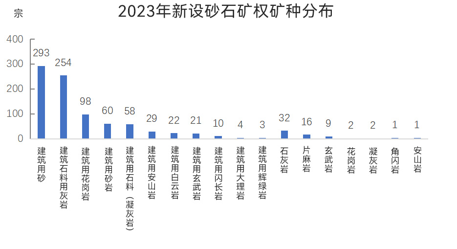全國新設(shè)砂石礦權(quán)中,有建筑用砂、建筑石料用灰?guī)r、建筑用花崗巖、建筑用砂巖、建筑用石料(凝灰?guī)r)、建筑用安山巖、建筑用白云巖、建筑用玄武巖、建筑用閃長巖、建筑用大理巖、建筑用輝綠巖、石灰?guī)r、片麻巖、玄武巖、花崗巖、凝灰?guī)r、角閃巖、安山巖18種礦種。其中建筑用砂、建筑石料用灰?guī)r兩類礦種新設(shè)礦權(quán)數(shù)量較多,分別為293宗、254宗;建筑用花崗巖、建筑用砂巖、建筑用石料(凝灰?guī)r)新設(shè)礦權(quán)數(shù)量為50~100宗;建筑用安山巖、建筑用白云巖、建筑用玄武巖、建筑用閃長巖新設(shè)礦權(quán)數(shù)量為10~30宗;建筑用大理巖、建筑用輝綠巖新設(shè)礦權(quán)數(shù)量為1~5宗;另外,新設(shè)32宗石灰?guī)r礦、16宗片麻巖礦、9宗玄武巖礦、2宗花崗巖礦、2宗凝灰?guī)r礦、1宗角閃巖礦、1宗安山巖礦。