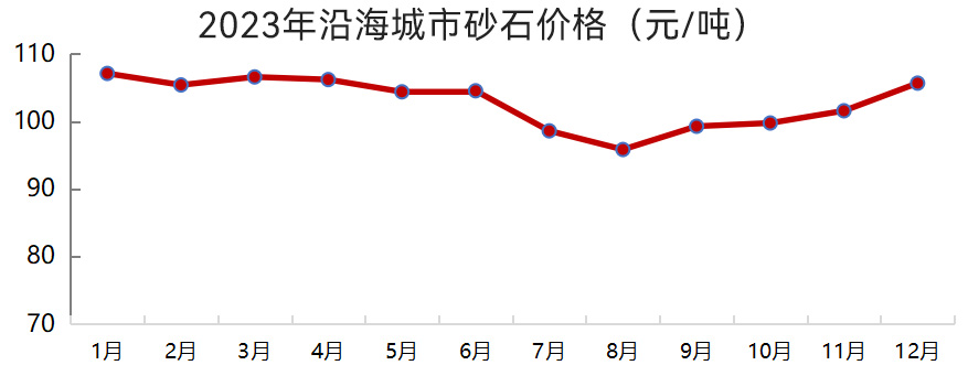 沿江、沿海城市砂石價格也整體呈下滑趨勢,其中二季度需求偏弱,砂石價格下滑較為明顯。12月,沿江、沿海城市砂石均價分別為110元/噸、106元/噸,較2023年年初分別下跌1.3%、1.0%。