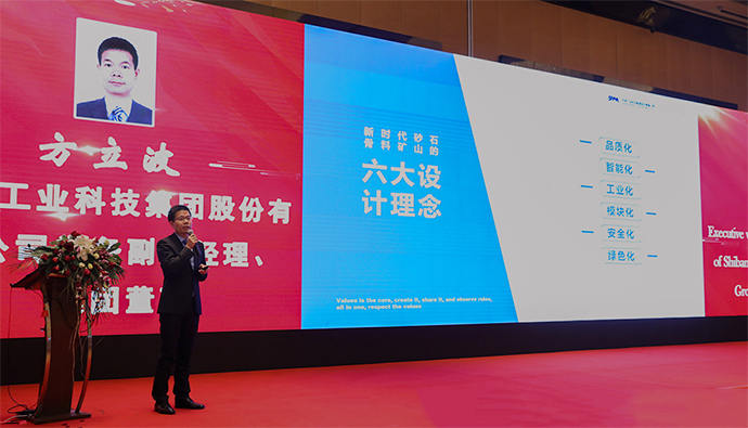 2019年砂石骨料大會(huì)上,世邦集團(tuán)常務(wù)副總方立波向參會(huì)人員講解世邦綠色化等六大設(shè)計(jì)理念。