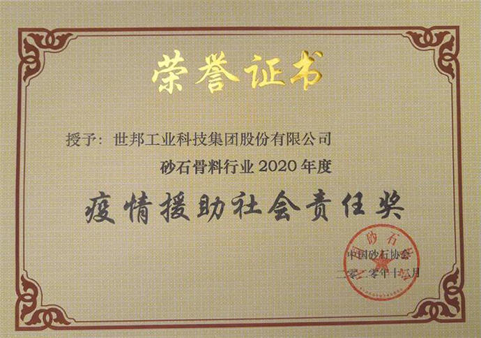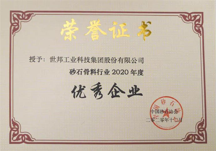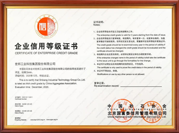 12月14日,中國(guó)砂石協(xié)會(huì)年會(huì)公布2020年度中國(guó)砂石行業(yè)企業(yè)信用等級(jí)評(píng)價(jià)結(jié)果,世邦工業(yè)科技集團(tuán)股份有限公司被評(píng)為AAA級(jí)信用企業(yè)。
