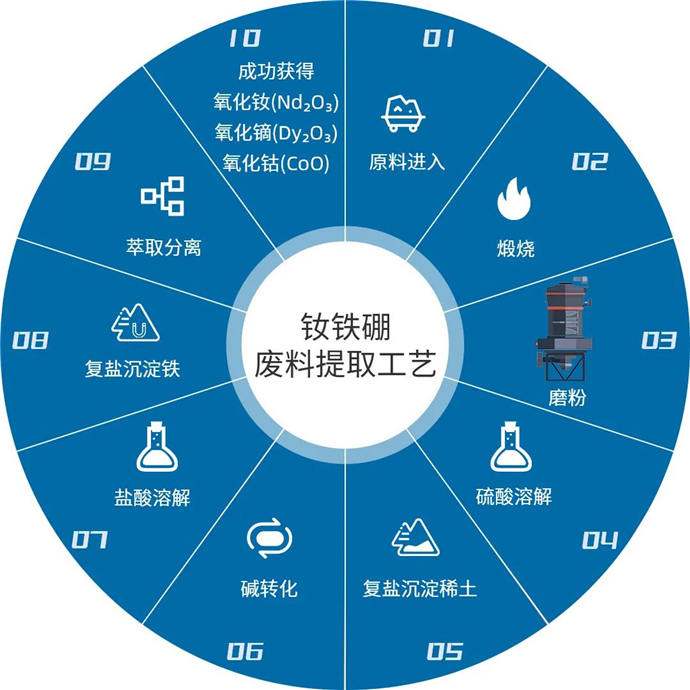 釹鐵硼主要成分為稀土元素釹(Nd)、鐵(Fe)、硼(B),其中稀土元素主要為釹(Nd)。釹鐵硼磁性材料在生產(chǎn)過(guò)程中容易產(chǎn)生大量的廢料,為了節(jié)約資源,避免稀土資源的浪費(fèi)和工業(yè)污染,對(duì)釹鐵硼廢料的處理顯得至關(guān)重要。