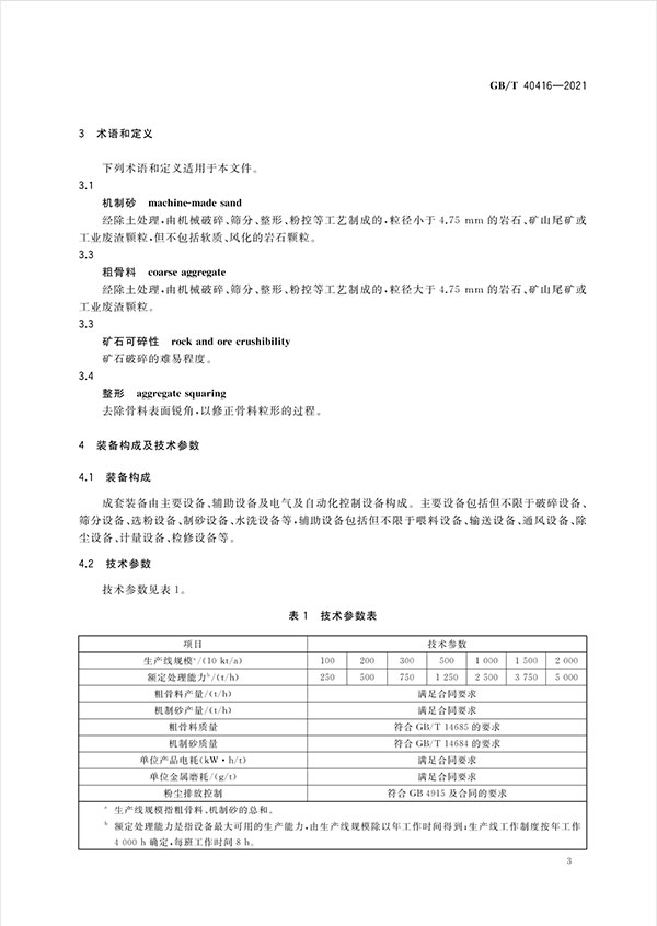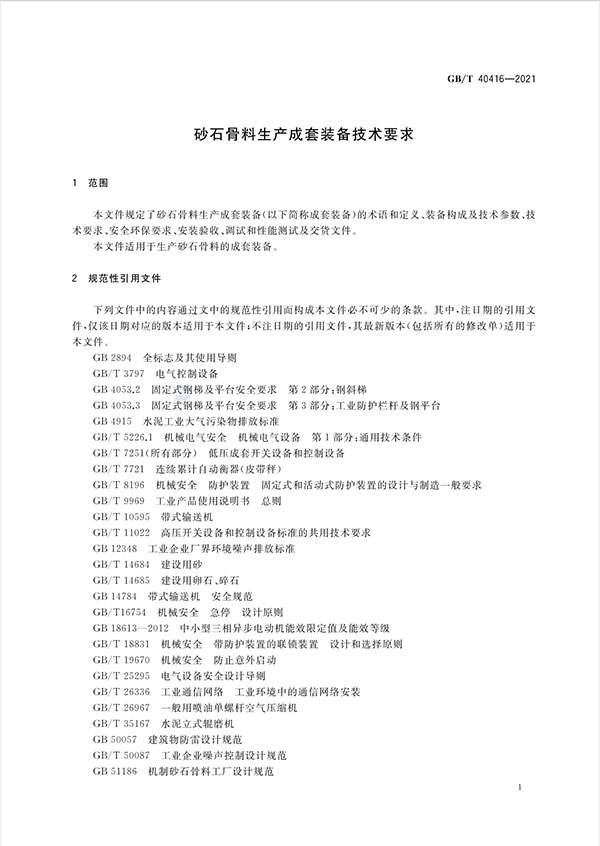本文件規(guī)定了砂石骨料生產(chǎn)成套裝備(以下簡(jiǎn)稱成套裝備)的術(shù)語和定義,裝備構(gòu)成及技術(shù)參數(shù)、技術(shù)要求、安全環(huán)保要求、安裝驗(yàn)收、調(diào)試和性能測(cè)試及交貨文件