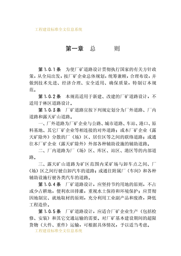 為使廠(chǎng)礦道路設(shè)計(jì)貫徹執(zhí)行國(guó)家的有關(guān)方針政策,從全局出發(fā),按廠(chǎng)礦企業(yè)總體規(guī)劃,統(tǒng)籌兼顧,合理布設(shè),并做到技術(shù)先進(jìn)、經(jīng)濟(jì)合理、安全適用、確保質(zhì)量,特制訂本規(guī)范。本規(guī)范適用于新建、改建的廠(chǎng)礦道路設(shè)計(jì),不適用于林區(qū)道路設(shè)計(jì)。