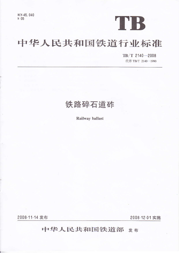 本標(biāo)準(zhǔn)規(guī)定了鐵路碎石道砟的技術(shù)要求、檢驗規(guī)則和運輸、貯存、驗交。明確對道砟粒徑、級配、顆粒形狀及清潔度的檢驗指標(biāo);對道砟集料壓碎率指標(biāo)值做出規(guī)范;對道砟運輸貯存提出了更為嚴(yán)格的要求,保證出場上道道砟的級配符合本標(biāo)準(zhǔn)的相關(guān)要求。