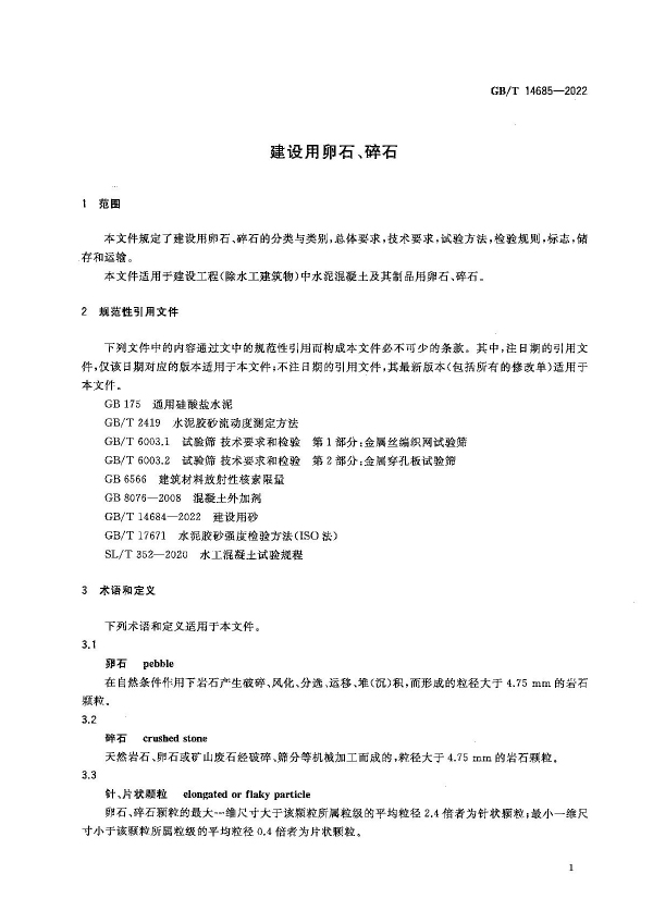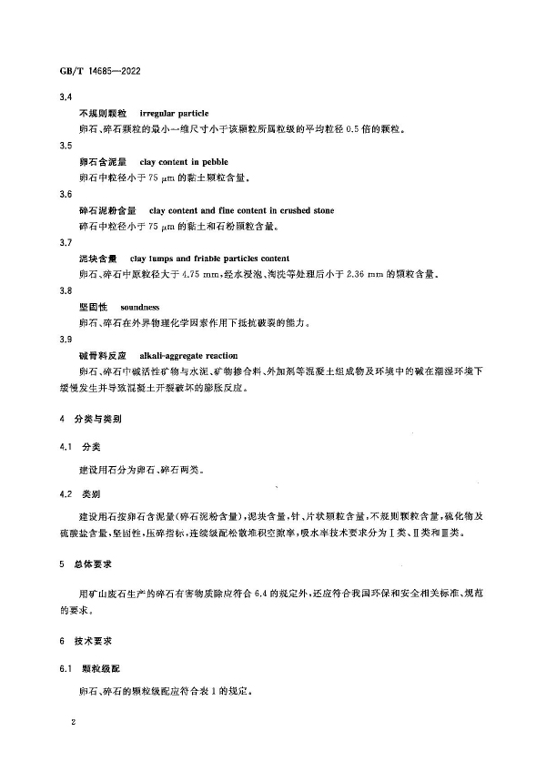 建筑用石料的生產不僅會影響自然環(huán)境,還影響工程建設質量。隨著工程建筑對石料的消耗不斷增加,石料的來源趨于復雜,同時隨著工程技術的進步,對混凝土質量要求提高,對石料的質量要求也不斷提高。本標準適用于建設工程中水泥混凝土及其制品用卵石、碎石。